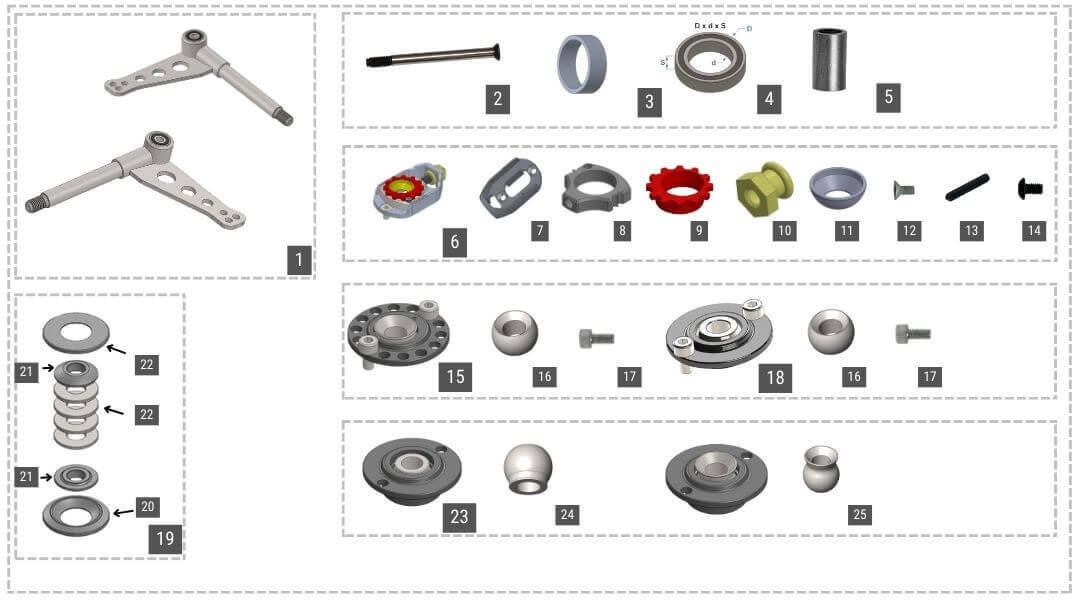 Merlin & Parolin 8mm Spindles and Parts for Mini and Cadet size karts. Easy Caster Camber, Eccentric and Spacer Parts. Used on Merlin Cadet, Parolin Opportunity